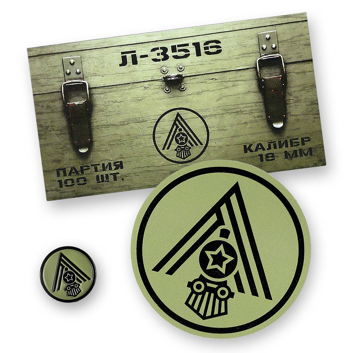 - К каждому знаку предусмотрена наклейка с таким же дизайном, а также карточка, стилизованная под ящик с боеприпасами